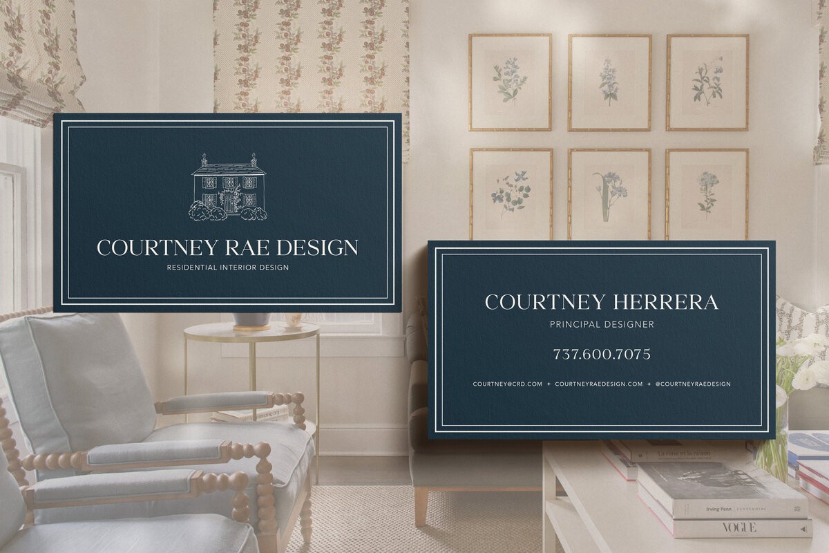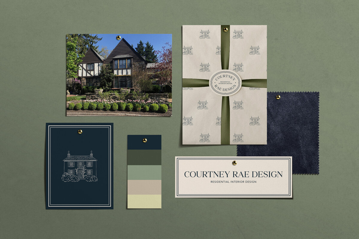 When a seasoned interior designer launched her own independent studio, we built her brand from the ground up. Anchored by a custom Tudor house illustration inspired by her childhood home, the identity was brought to life through a luxe color palette of deep navy, fern, butter yellow, and taupe, paired with elegant typography. The brand expanded into a full website, business cards, yard signage, process documents, and social posts.
